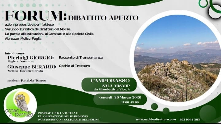 Il Comitato "Occhio al Tratturo" accende i riflettori sul patrimonio paesaggistico e culturale del Molise, promuovendo un importante momento di confronto pubblico sul progetto di sviluppo turistico legato ai tratturi. L'iniziativa si terrà il prossimo 20 marzo 2026, alle ore 17.00, a Campobasso, presso la Sala ARSAP in via G.B. Vico.