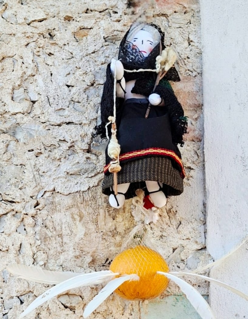 L'Arancia e le Piume: Il cuore del rituale è il dispositivo a pendolo sotto la sua gonna: un'arancia o una patata (entrambi legati alla terra) trafitta da sette penne di gallina. Questo "pennaturo" è un orologio naturale: ogni penna rappresenta una settimana che ci separa dalla Risurrezione. Strappare una penna ogni domenica è un atto che segna l'avvicinamento al nuovo inizio, proprio come l'attesa del pastore per la fine dell'inverno e l'inizio della nuova stagione.