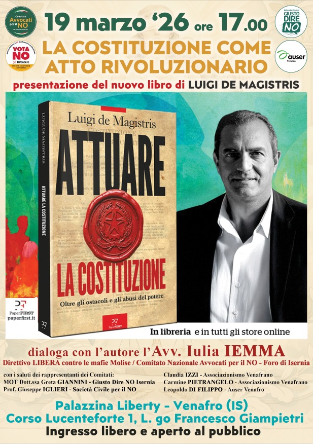Si terrà martedì 19 marzo, alle ore 17:00, presso la suggestiva cornice della Palazzina Liberty di Venafro, in Corso Lucenteforte 1, Largo Francesco Giampietri, la presentazione dell'ultimo libro di Luigi de Magistris, dal titolo "Attuare la Costituzione". L'incontro, aperto alla partecipazione di tutta la cittadinanza, si prefigura come un momento di alto valore civile, volto a stimolare una riflessione profonda sullo stato della democrazia in Italia.