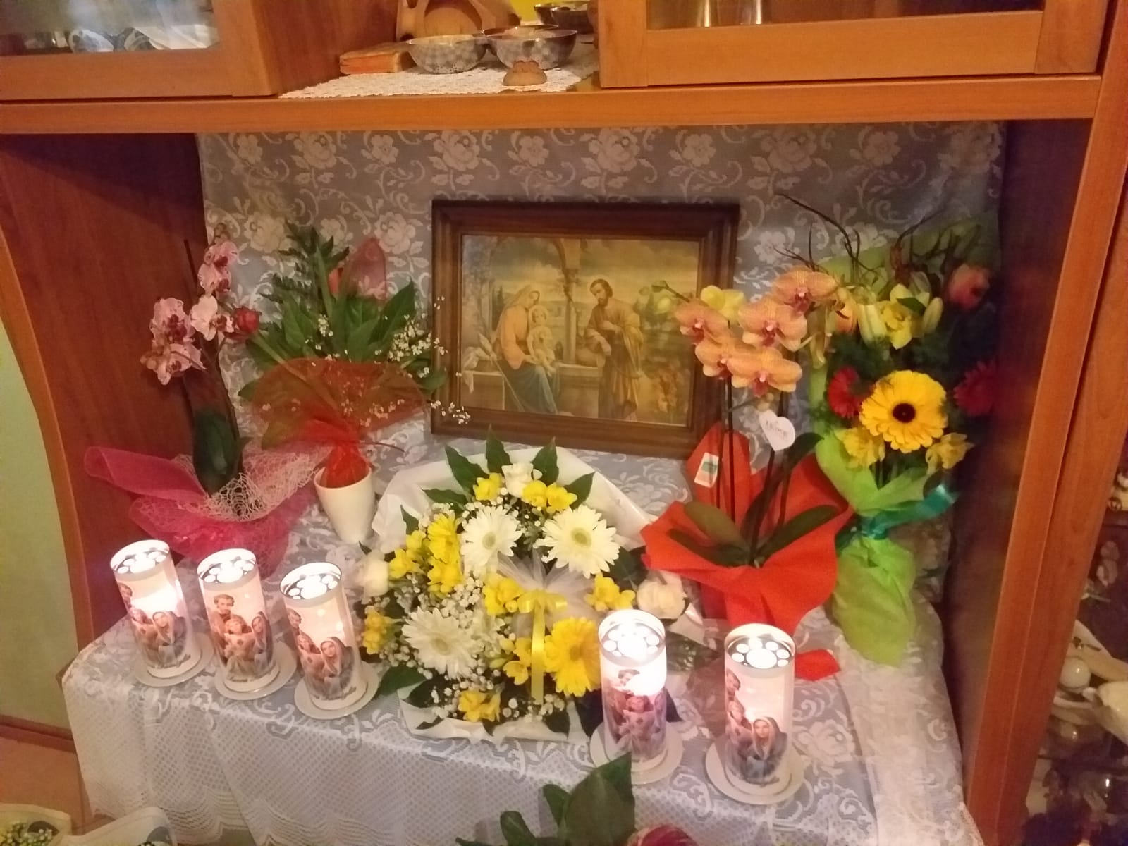 La giornata del 19 marzo inizia con la messa che si celebra intorno alle 9, per permettere anche agli organizzatori di parteciparvi. Verso le 13 ci si reca nelle abitazioni, dove, appena si entra, si saluta con: Gesù Maria, Gesummarì e si risponde: c'è sempr, cioè: oggi e sempre. Ci si avvia verso l'angolo della casa, dove è stato allestito l'altarino su cui è collocato un quadro del santo e/o della Sacra Famiglia, circondato da fiori, piante e lumicini. Una persona legge le preghiere di invocazione a S. Giuseppe, molto antiche, poi ognuno prende il proprio posto con ordine e in silenzio. Il tavolo principale è posto vicino all'altarino e si compone dei tre che rappresentano la sacra famiglia, il bambino, la donna e l'uomo. Il bambino ricoprirà questo ruolo fino a quando non sarà sposato. Poi si iniziano a servire i piatti, costituiti da pietanze a base di baccalà, verdure e legumi. E i famosi "calzoni", ovvero dolci a base di miele e ceci, ricoperti di pasta sfoglia e poi fritti. Alla fine del pranzo, si recitano preghiere di ringraziamento al santo e gli ospiti vanno via. Per preparare questo pranzo si impiega molto tempo e occorre l'aiuto di tante persone. Il pomeriggio il paese si riempie di gente che gira le varie strade per assaggiare alcune pietanze presso le diverse case dove c'è il convito. Lo spirito di questa tradizione è sempre stato quello di aprire le porte della propria modesta casa ai poveri e bisognosi per ristorarli e far trascorrere loro una momento di convivialità, in compagnia e in preghiera.