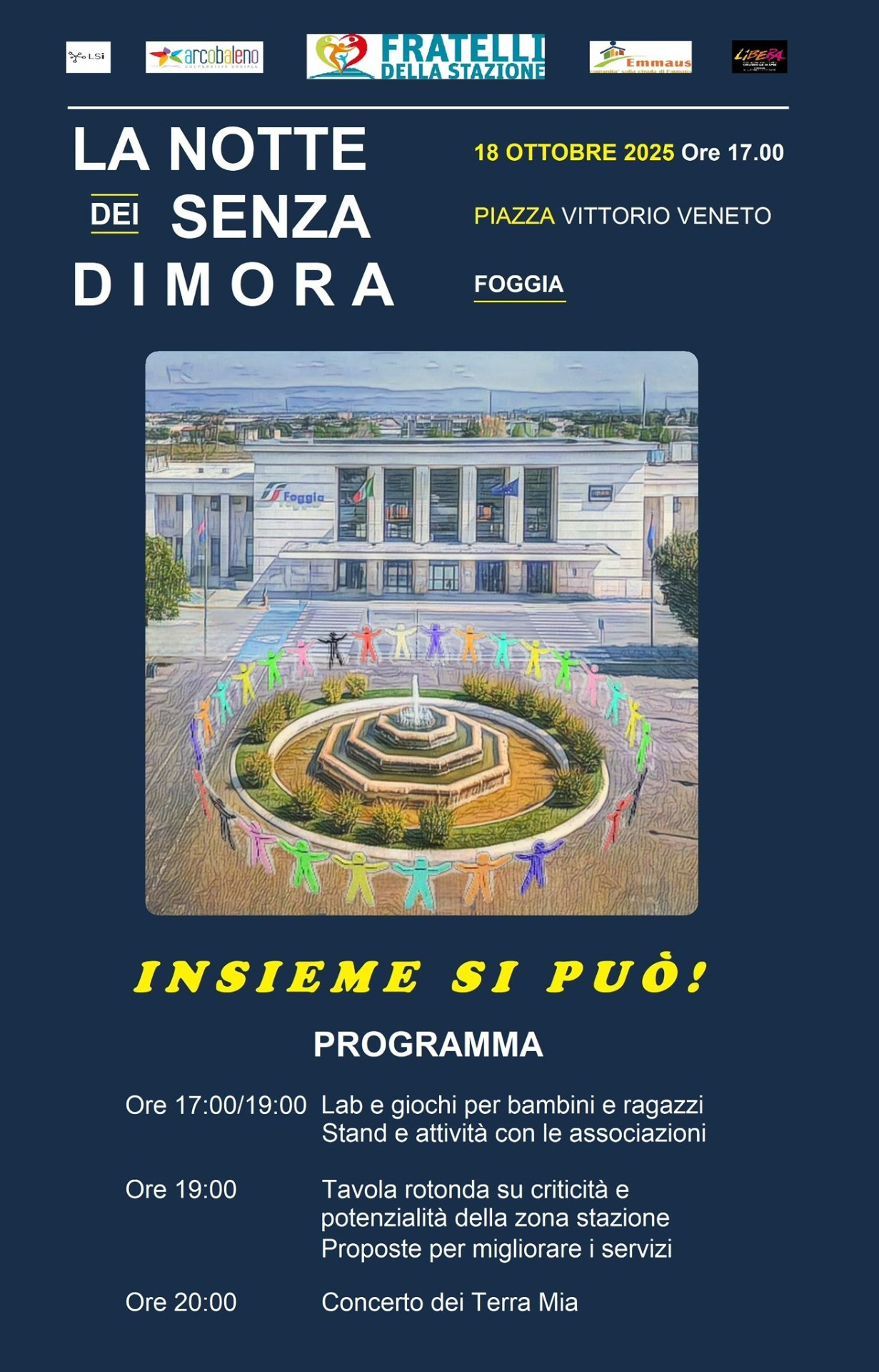 Anche quest'anno la città di Foggia rinnova il suo impegno a favore delle persone più fragili partecipando a "La Notte dei Senza Dimora", l'iniziativa nazionale dedicata alla sensibilizzazione sul tema della povertà estrema, dell'emarginazione sociale e del diritto alla dignità. L'appuntamento è fissato per sabato 18 ottobre 2025, a partire dalle ore 17.00, in Piazza Vittorio Veneto, luogo simbolo del cuore cittadino e spazio di incontro tra la cittadinanza e chi vive quotidianamente la realtà della strada.