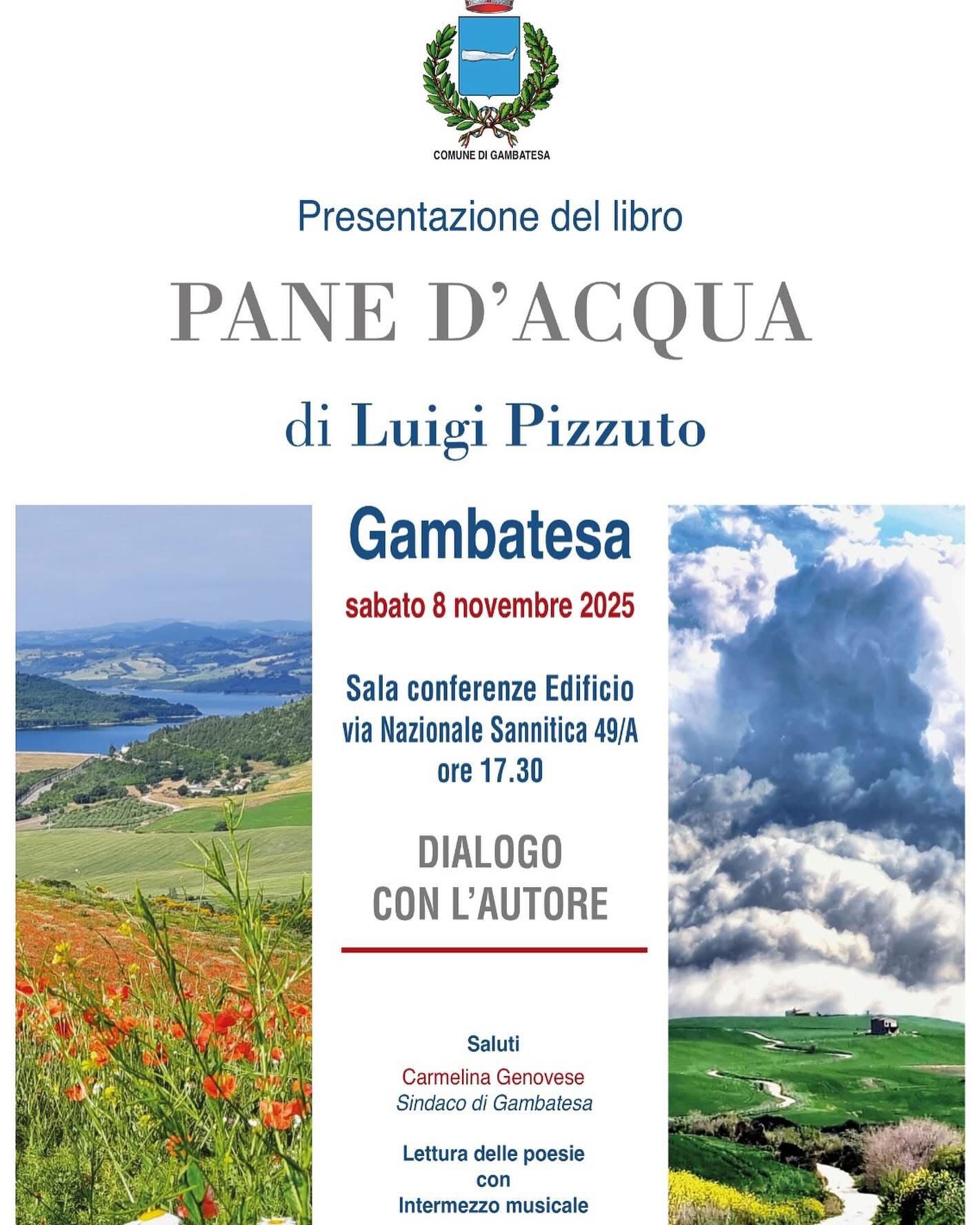 Sabato 8 novembre, alle ore 17:30, presso la sala conferenze dell'Istituto d'Istruzione "Guglielmo Josa" di Gambatesa (via Nazionale Sannitica n. 49A), si terrà la presentazione al pubblico della silloge poetica Pane d'acqua di Luigi Pizzuto, scrittore, poeta e docente di lingua italiana originario di Colletorto.