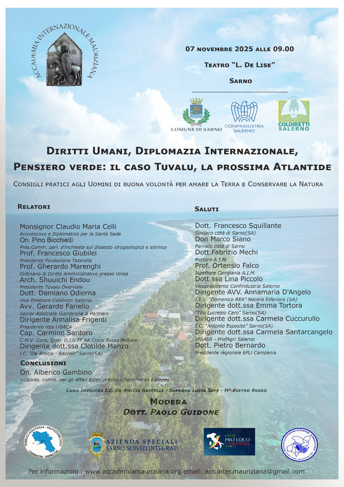 Venerdì 7 novembre 2025, Sarno si trasforma in un crocevia di idee, culture e speranze universali. Il Teatro Comunale "L. de Lise" ospita il Convegno Internazionale "Diritti Umani, Diplomazia Internazionale, Pensiero Verde: Il caso Tuvalu, la prossima Atlantide", promosso dall'Accademia Internazionale Mauriziana con la guida del Delegato campano Prof. Paolo Guidone.