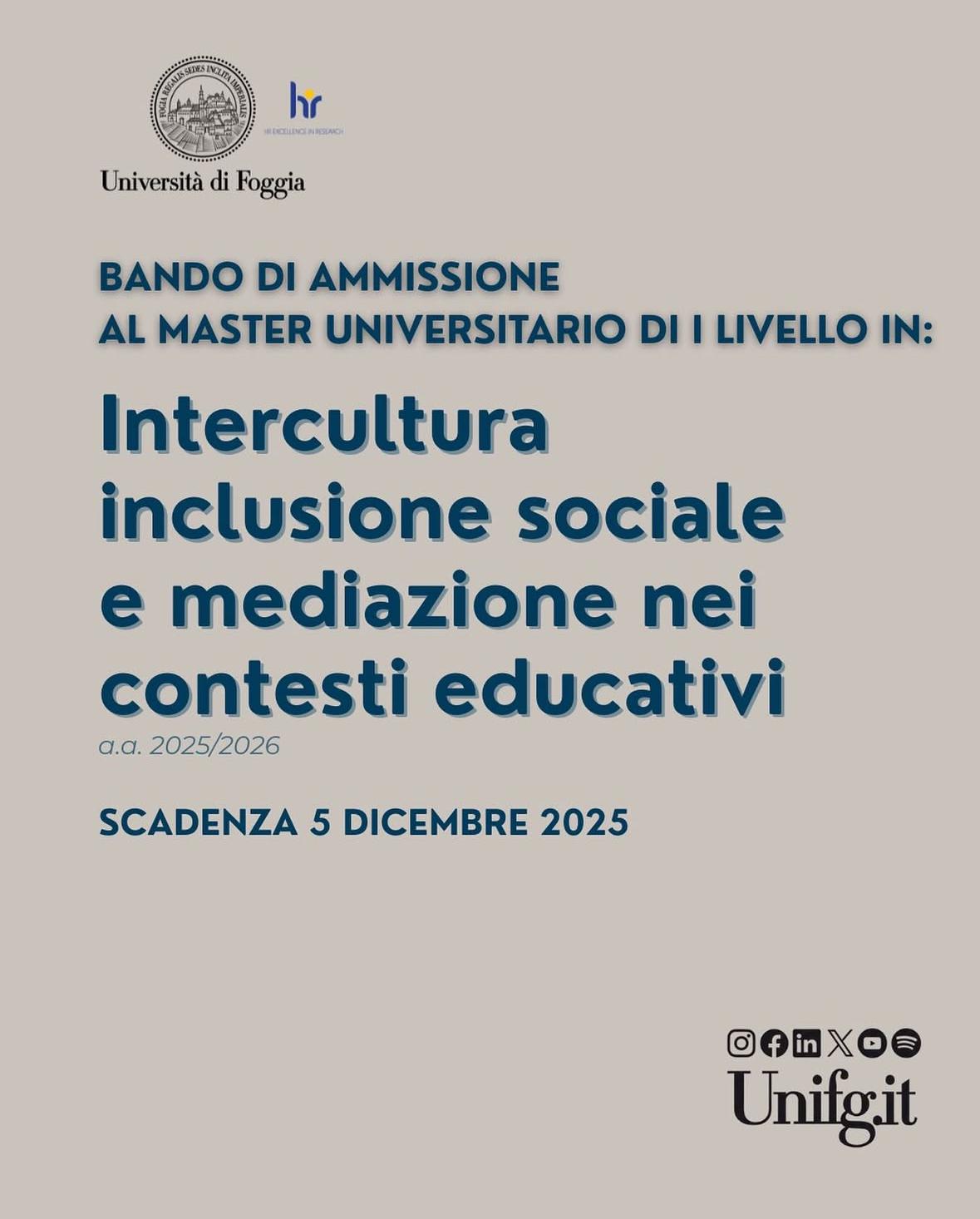 Per informazioni: learningsciencesinstitute@unifg.it; bando e dettagli: https://www.unifg.it/it/studiare/corsi-post-laurea/intercultura-inclusione-sociale-e-mediazione-nei-contesti-educativi.