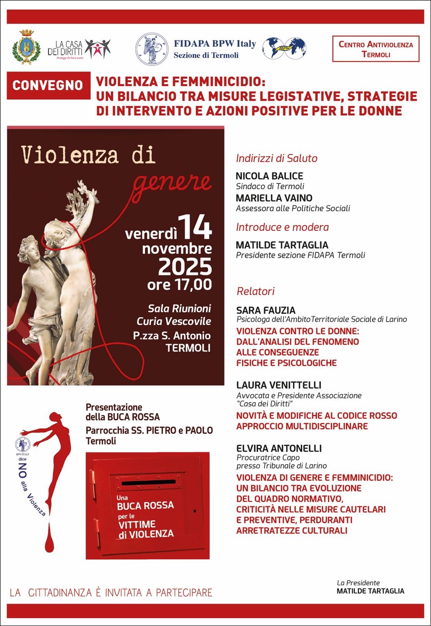 Durante il convegno sarà presentata la BUCA ROSSA, simbolo di ascolto e speranza, che, come le panchine rosse, intende sensibilizzare la cittadinanza contro la violenza di genere. Sarà installata presso la Parrocchia SS. Pietro e Paolo di Termoli per raccogliere in forma anonima richieste di aiuto da parte di donne in difficoltà, offrendo loro un canale sicuro e concreto di supporto.